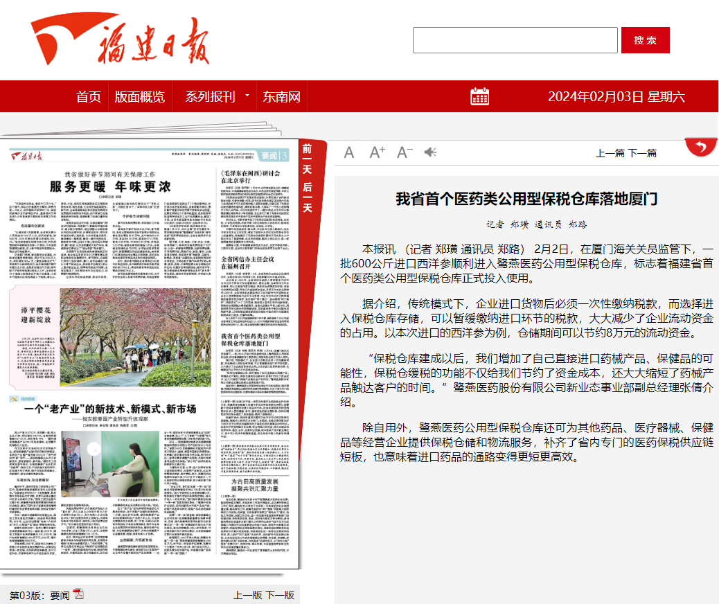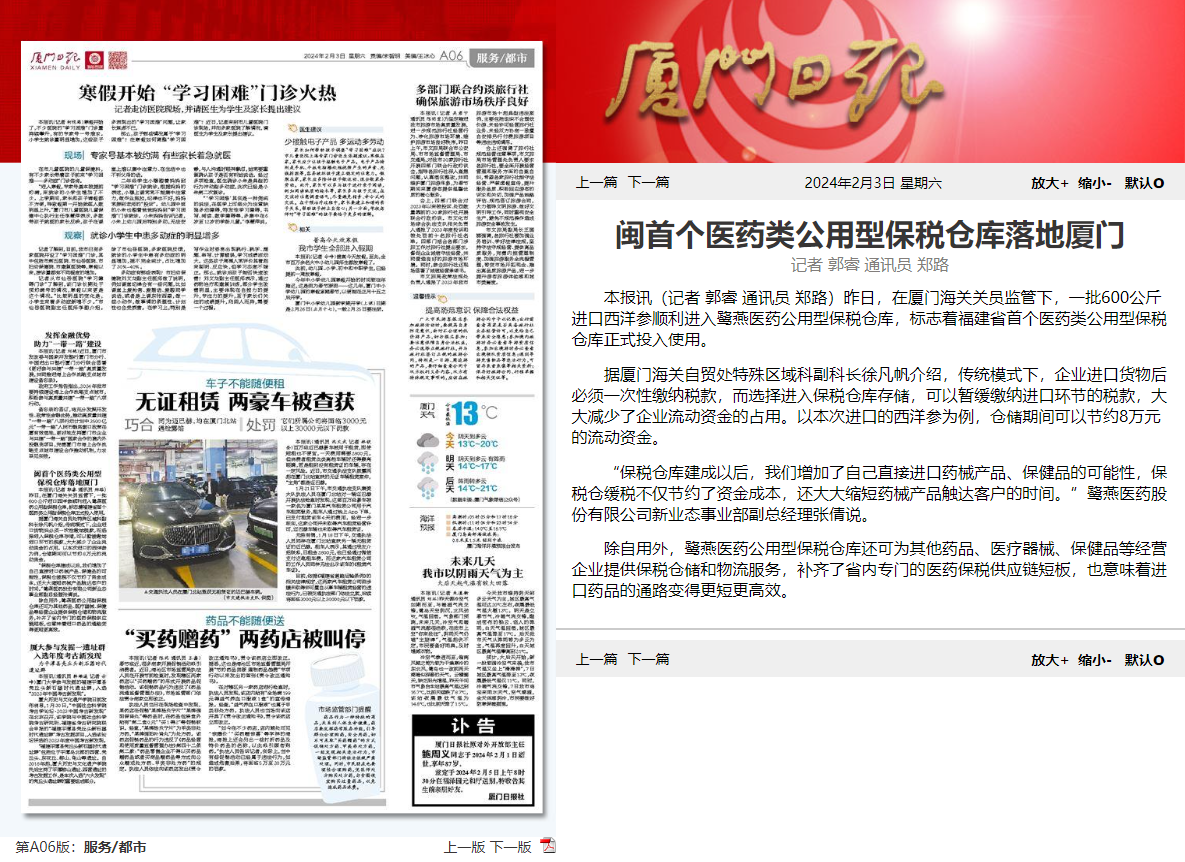 202422日,鷺燕醫藥公用型保稅倉獲批投用,《福建日報》《廈門日報》相繼報道相關新聞。鷺燕醫藥公用型保稅倉是福建省首個醫藥類公用型保稅倉庫該保稅倉庫的投用,意味著廈門市乃至福建省補齊了區域內專門的醫藥保稅供應鏈物流服務,也意味著廈門和福建進口藥品的通路變得更短,更為高效。